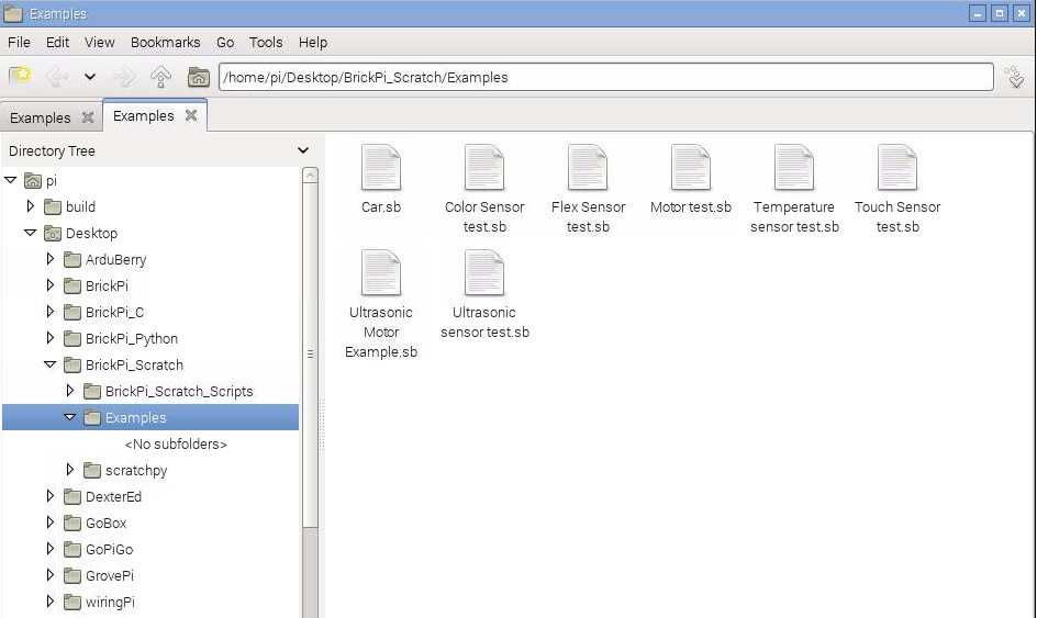 Next, click “Open Examples”. This will open the directory of Scratch examples for the BrickPi. Double click on one of the examples and it will open the example in Scratch.